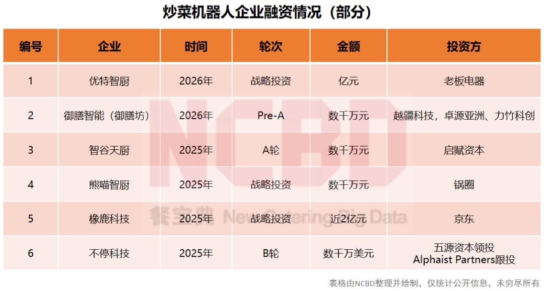 2025年为炒菜机器人行业元年,资本加速涌入,主要聚焦于技术研发、场景拓展和产业链整合。2025年以来,橡鹿科技、优特智厨等企业相继获得融资,彰显了资本市场对行业发展前景的关注与认可。