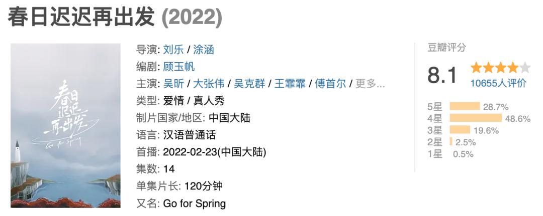 其实对于很多芒果粉来说,小众综艺《春日迟迟再出发》是很多人的意难平,它的豆瓣评分8.1分是其在内容深挖方面的认可,且在感受中受过伤的人先治愈再度选择是否恋爱的设置,也非常符合当下社会的情绪需求,然而,芒果和刘乐没有坚持这档综艺的系列化开发,以至于后期关于熟龄人的情感恋爱观选择被其它平台综艺所占据,这是一大遗憾。