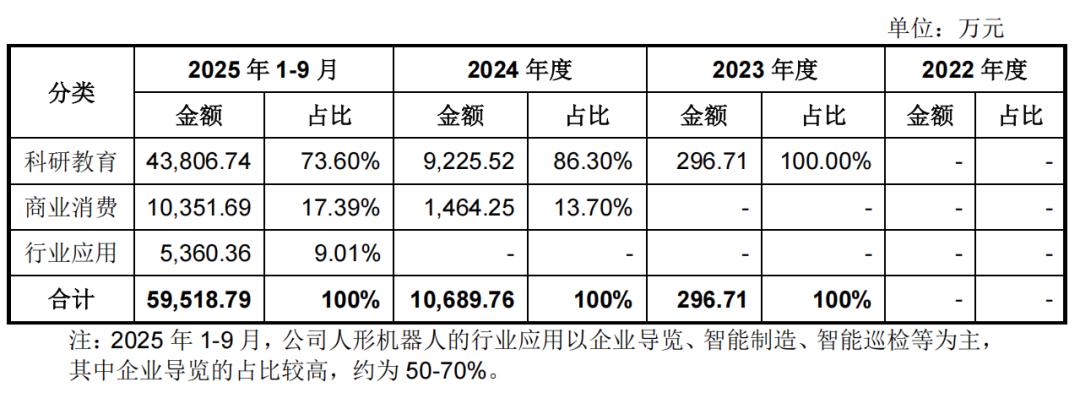 其中,2025年1-9月,四足机器人商业消费领域的销售比例显著上升,并超过了科研领域,主要受益于消费级四足机器人线上销售收入的快速上升。