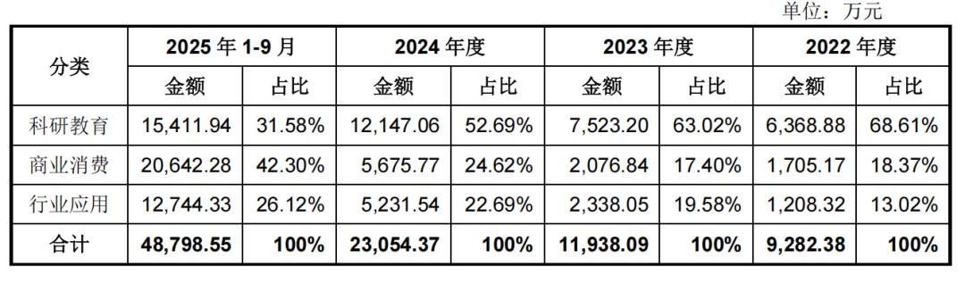科研教育领域收入整体占比较高,商业消费及行业应用领域的收入增长相对较快。