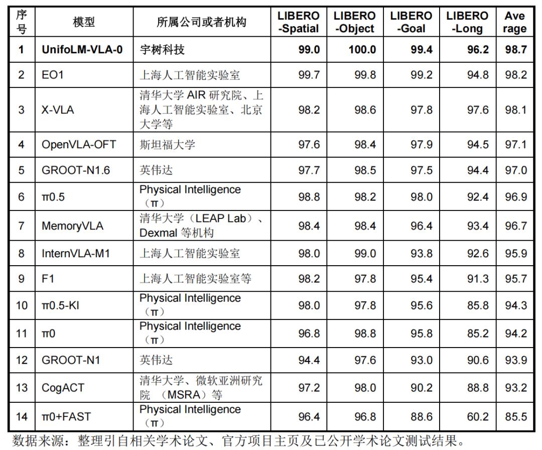 基于LIBERO基准测试,其UnifoLM-VLA-0模型与国内外相关“大脑”模型测试情况对比如下: