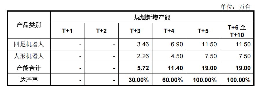 在这次募投中,宇树通过“智能机器人制造基地建设项目”来实现产能扩充。根据规划,项目建设期2年,规划产能19万台/年,T+3年开始逐步投产,并于T+5年全部达产。