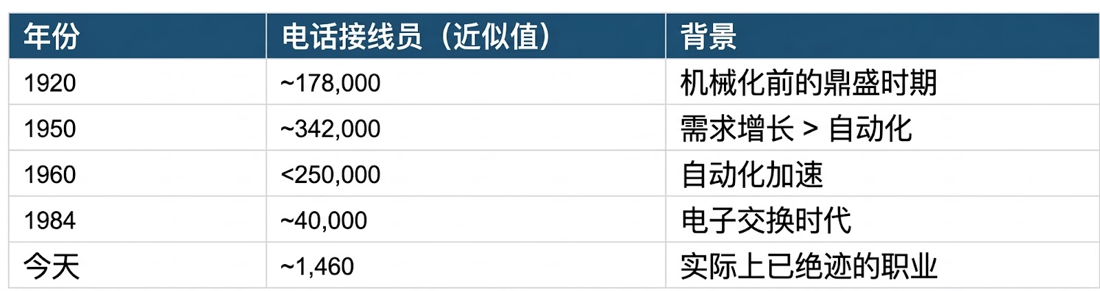 案例 3:电话话务员与自动化(1920–1960 年代)
