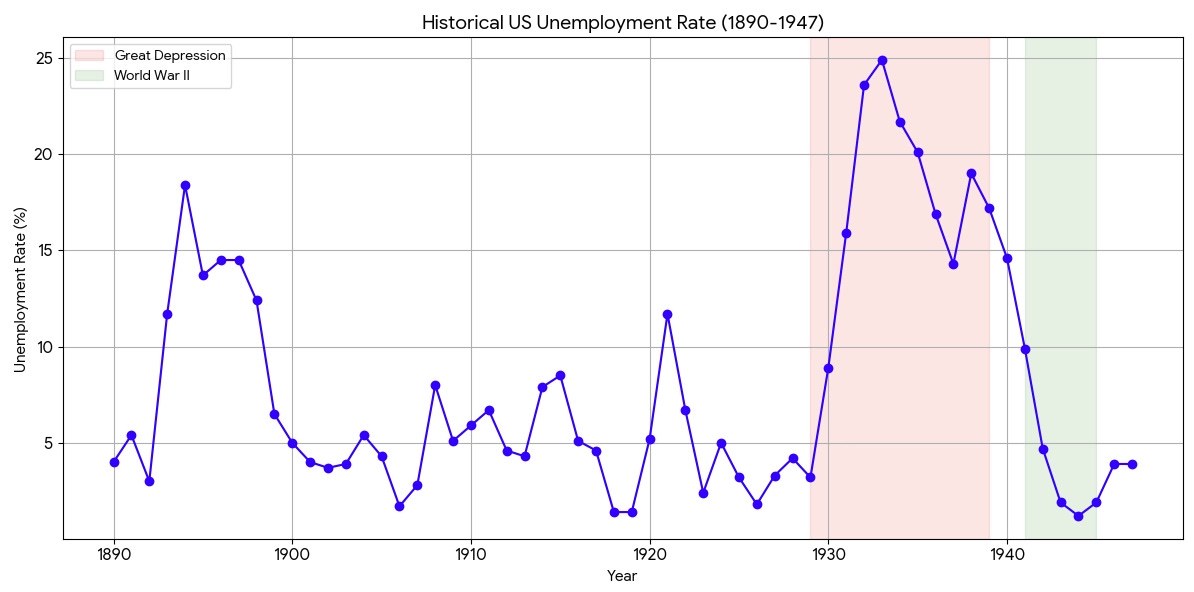 美国失业率(1890-1947 年)情况。数据来源:彭博社