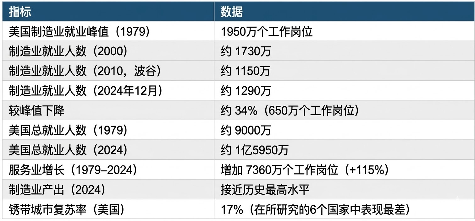 随着 1993 年北美自由贸易协定(NAFTA)的签署以及 2001 年中国加入世贸组织(WTO),人们开始担心制造业岗位会流出美国。国家经济确实增长了——受服务业扩张驱动,美国总就业人数从 1979 年的约 9000 万人增加到 2024 年的约 1.595 亿人(增长 80%)。但这些收益并非平均分配。像弗林特(通用汽车员工从 8 万人锐减)、代顿(失去 1.5 万个制造业岗位)以及莫内森(钢厂关闭后失去了三分之二的人口)等城市经历了毁灭性的衰落。