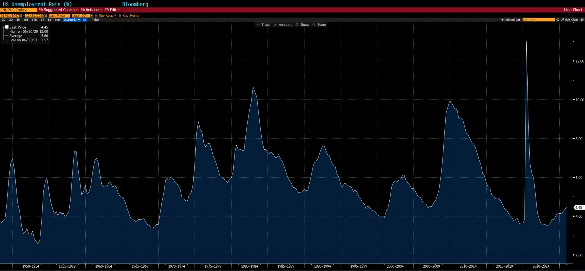 美国失业率(1950 年至今)情况。数据来源:彭博社