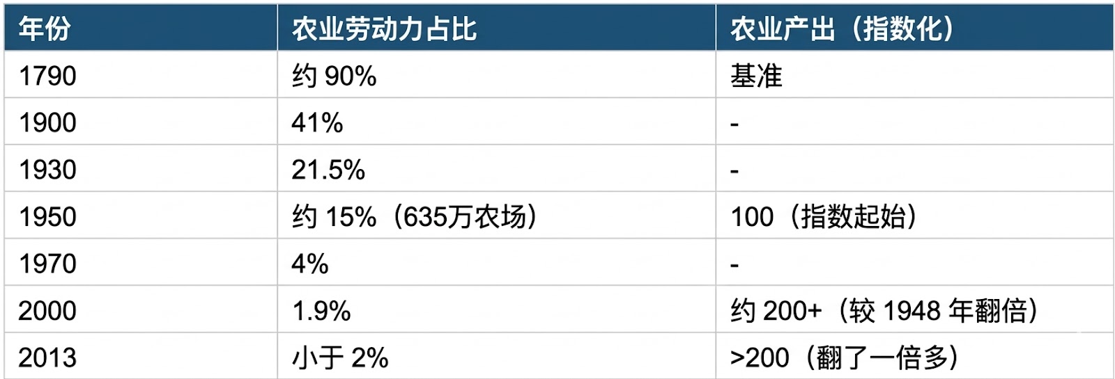 农业劳动力占美国总劳动力的比例从 41% 下降到不足 2%,这是美国历史上最大规模的职业转型之一。可是,农业产出却翻了一倍多,而被取代的劳动力随后被制造业、以及后来的服务业所吸收。