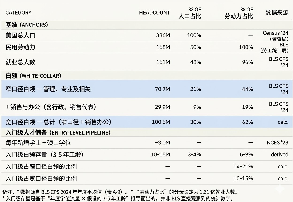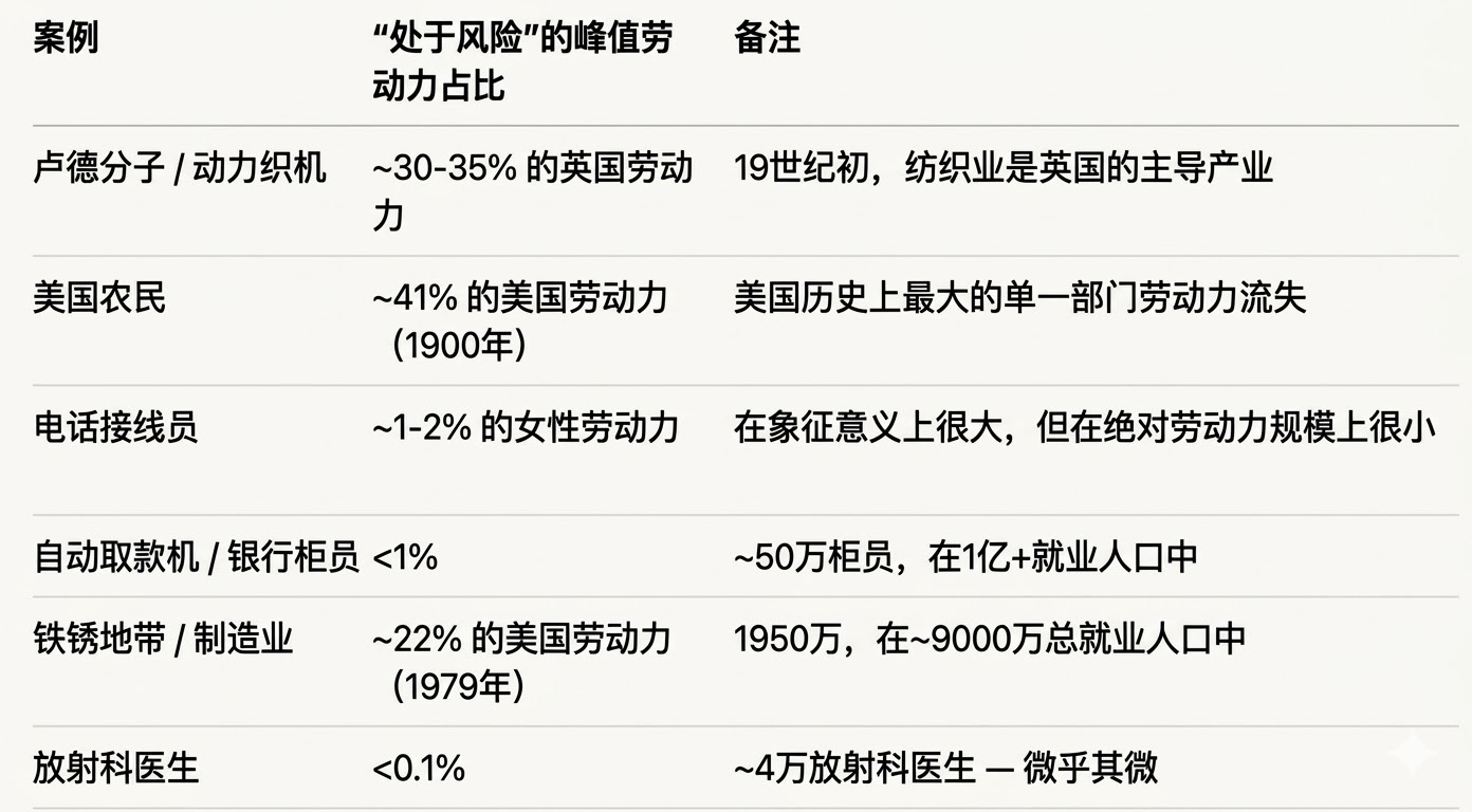 其次是普遍性——也许?以往的技术浪潮大多是每次自动化掉一个行业的特定体力任务。而白领工作占当今劳动力的约 40%,其规模之大,足以与历史上那些曾被视为脆弱的大型劳动力池相提并论。