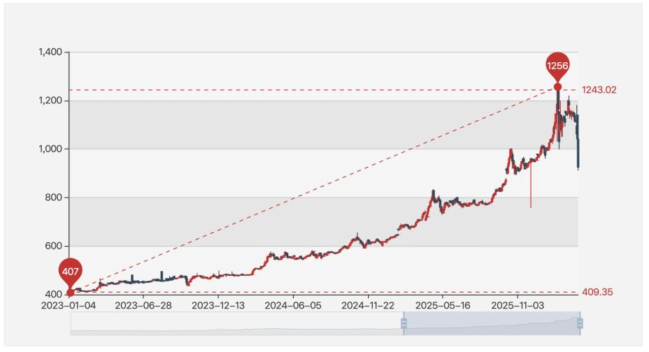 在此期间,黄金价格整体一路攀升。上海黄金交易所数据显示,Au99.99的价格从2023年初的400元/克出头一度增长至今年1月末的1256元/克,涨幅超过200%。