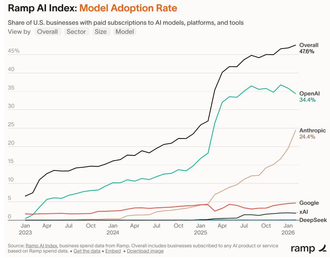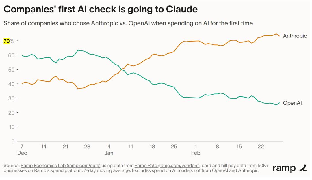 Ramp还指出,在新客户争夺中,Anthropic拿走了大约70%的首次采购份额。