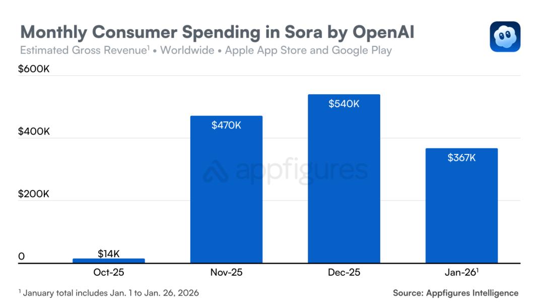 Appfigures数据显示,Sora App用户消费额从去年12月峰值的54万美元跌到今年1月的36.7万美元。