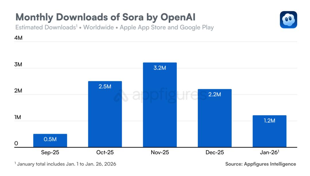 不过,应用情报机构Appfigures数据显示,Sora App在去年12月下载量环比下降32%,今年1月又环比下降45%,降至120万次。在美国App Store排名掉到一百名开外。