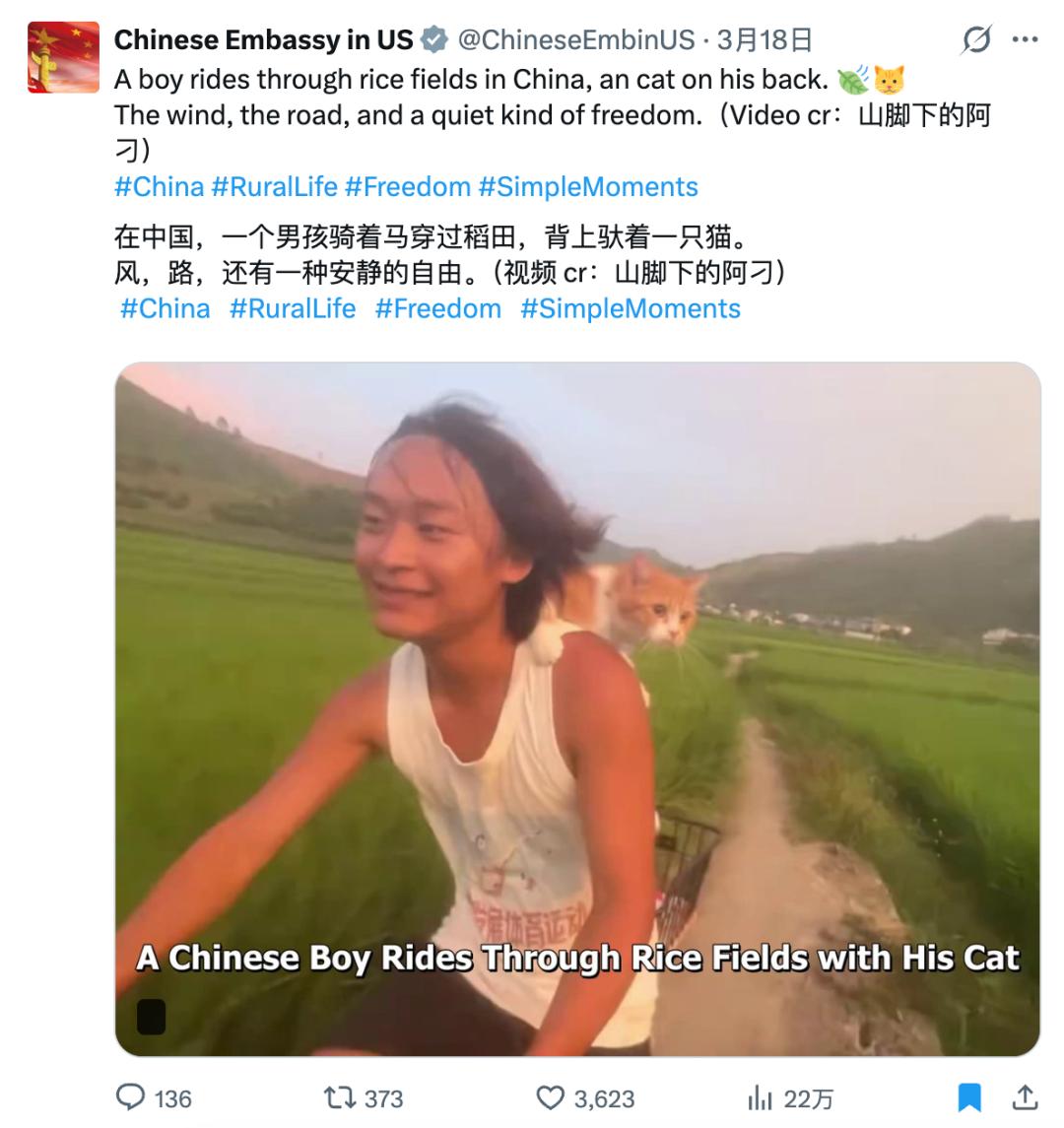 3 月 18 日,中国驻美国大使馆在官方推特上转载了这条视频,并注明了出处,给阿刁添了把火,全球网友们这才知道流量风暴中心的东方青年叫什么名字。