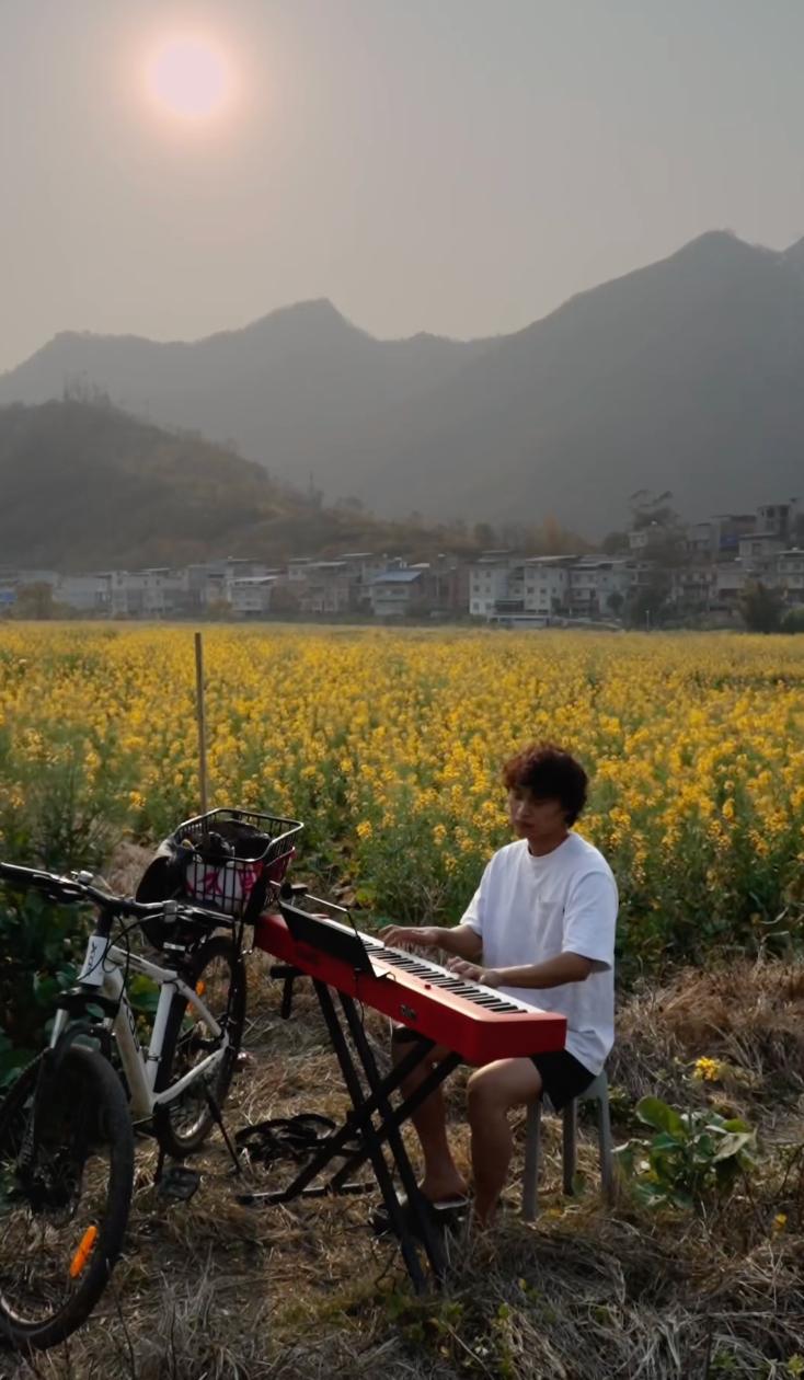 有时候阿刁的视频内容很朴素,比如打理一下菜地、去家旁边的河里游泳;有时候阿刁的视频内容很文艺,像是在麦田边弹键盘,或者对着牛弹吉他;有时候阿刁的视频又很抽象,像是化身钓鱼佬,带着自己钓到的大鱼,用浮夸的演技假装在村里迷路,嘴角比 AK 都难压。