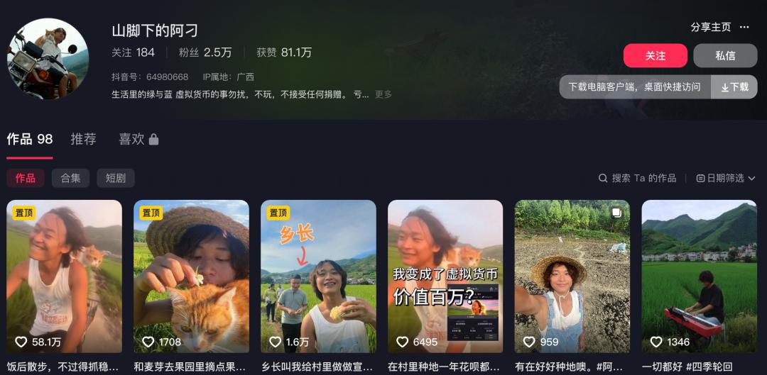 当时是 2025 年初,阿刁自己在出租屋里缓了一个月,然后彻底下定了决心,回家,做自媒体。