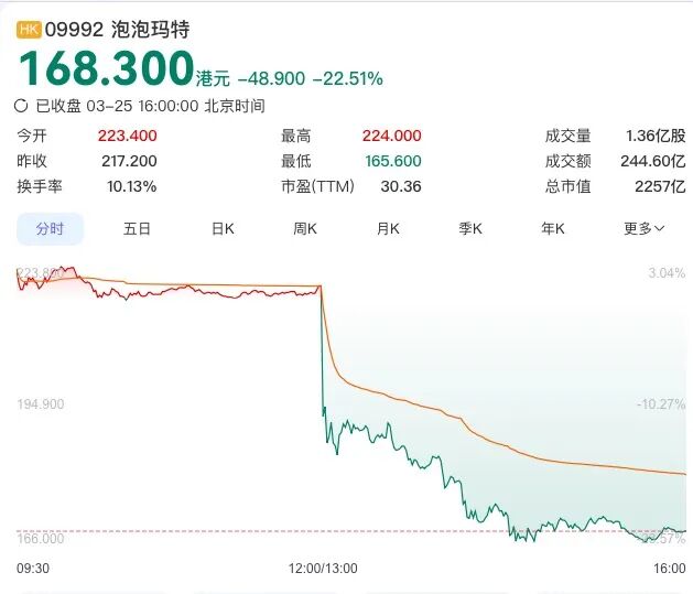 财报一出,下午开盘,泡泡玛特股价便应声下跌,一度跌至165.6港元/股,随后有所回调,截至收盘,为168.3港元/股,较开盘223.4港元/股跌近22.51%,直接创下自去年4月以来最大盘中跌幅。