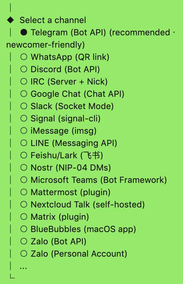 至于入口,本质上只是交互窗口,用户可以按习惯自由选择。比如,在部署OpenClaw的终端代码界面中,入口已经被统一在同一套能力之下、退化为一组可选项:Telegram、Discord、Slack、飞书,乃至微信ClawBot,都只是其中之一。