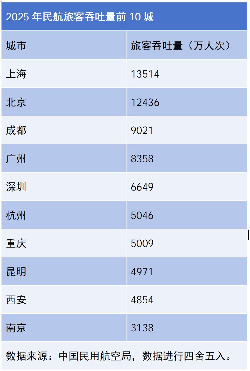 如果从城市角度看,航空旅客吞吐量排名前十的城市为:上海、北京、成都、广州、深圳、杭州、重庆、昆明、西安、南京。