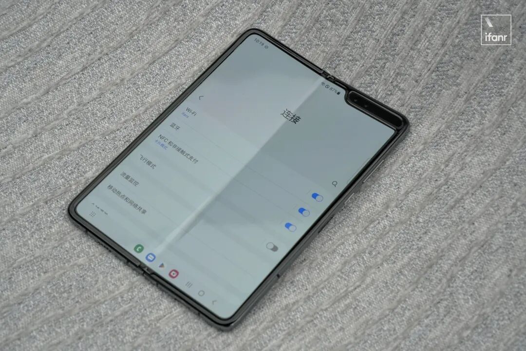 然而即使跨过这么多年,拿起这台 Galaxy Fold 最具有冲击力的第一观感,仍然是中间那条巨大的折痕: