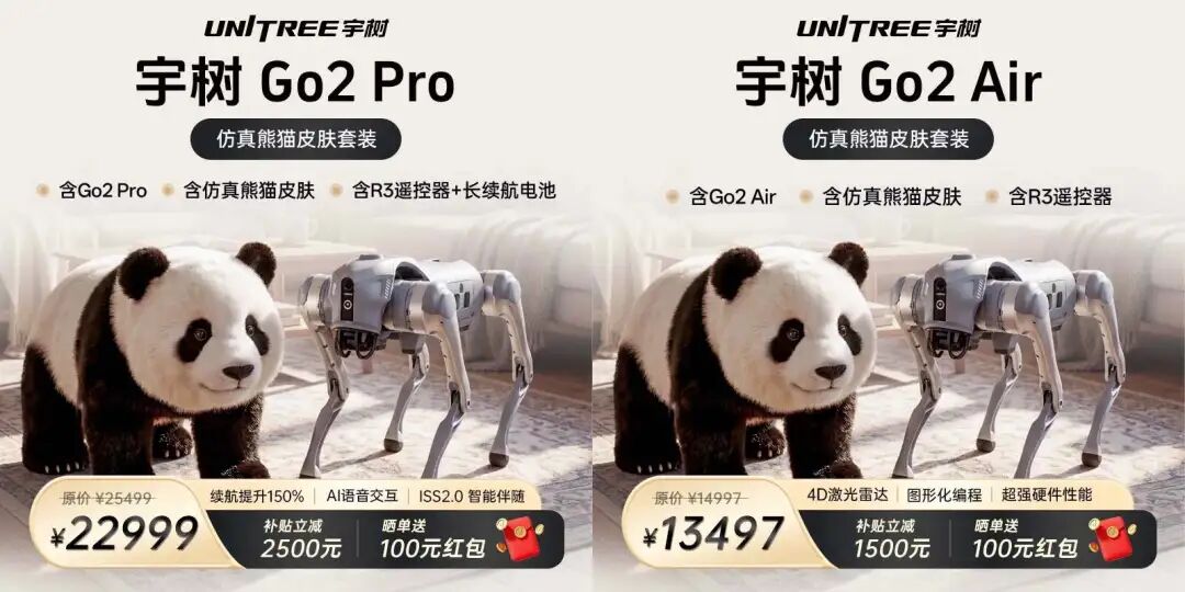 “宇树Go2 Pro仿真熊猫皮肤套装”,包含Go2 Pro+仿真熊猫皮肤+R3遥控器和长续航电池,定价25499元,电商平台优惠价22999元。