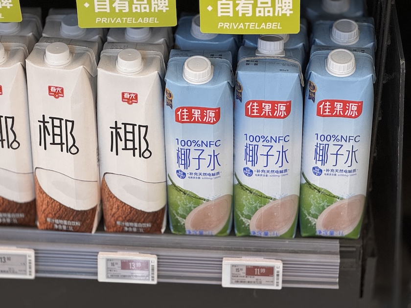 一家在华北拥有18家门店的连锁超市负责人对界面新闻表示,椰子水在2025年卖得很好,今年仍然会做堆头陈列。“这两年大家都在学胖东来,我们也在推自有品牌,比如1L装椰子水,价格在10元左右,销量不错。”