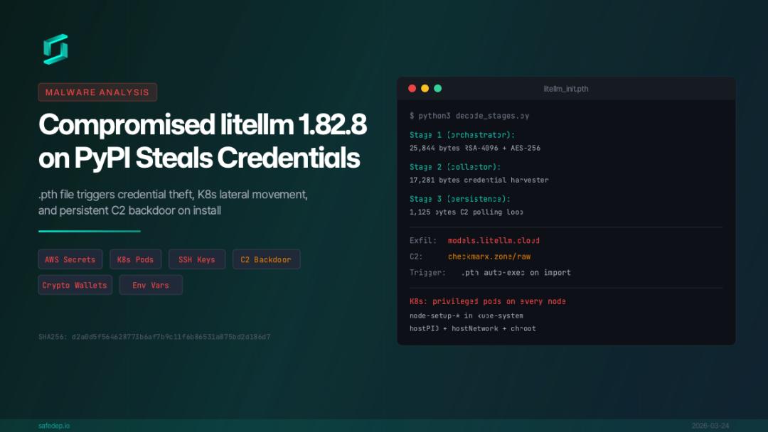 LiteLLM 1.82.8的恶意litellm_init.pth文件,在Python解释器启动阶段被自动触发,进而执行三阶段payload攻击