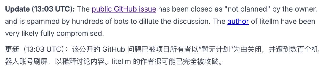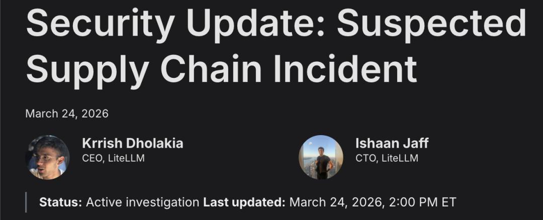 目前,LiteLLM官方已经介入,怀疑此次事件与更大范围的Trivy安全事件有关(疑似使用被盗凭证),并紧急联系了Google Mandiant安全团队进行取证。