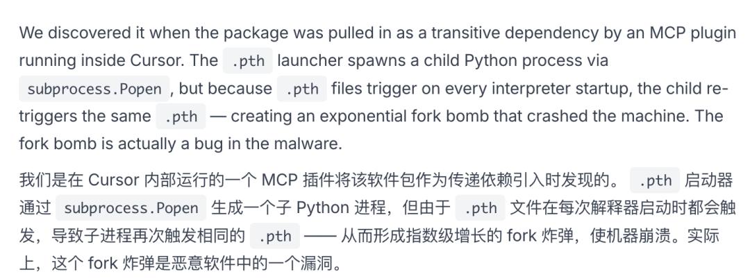 当时,他们在Cursor里使用一个MCP插件,而这个插件会把LiteLLM作为传递依赖拉进来。