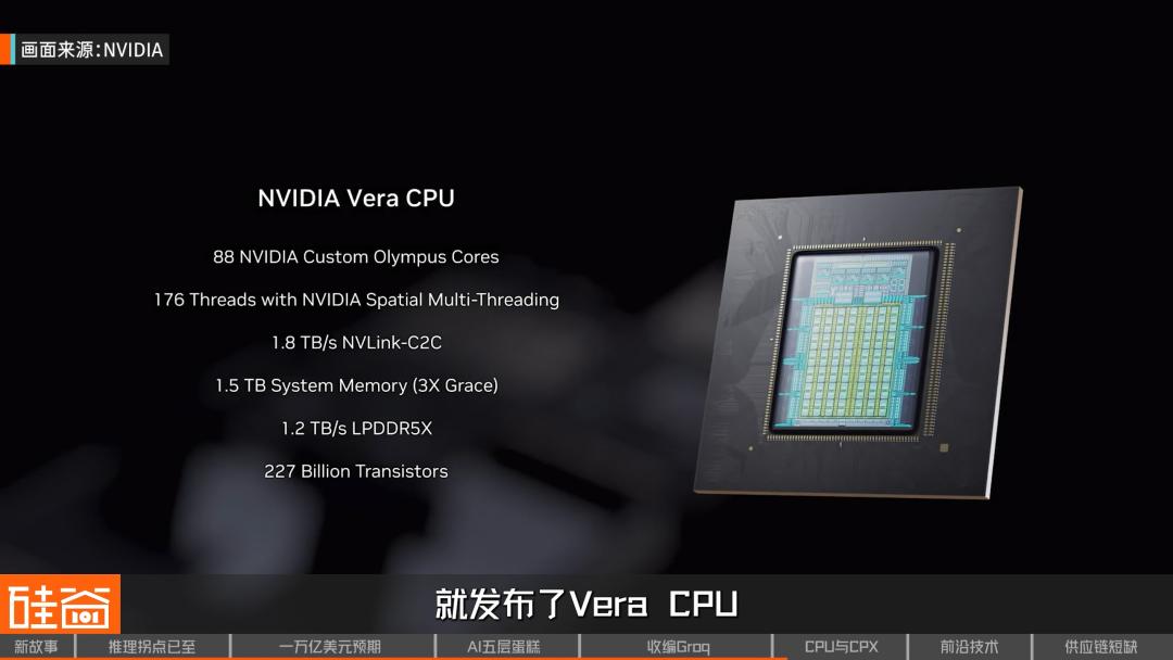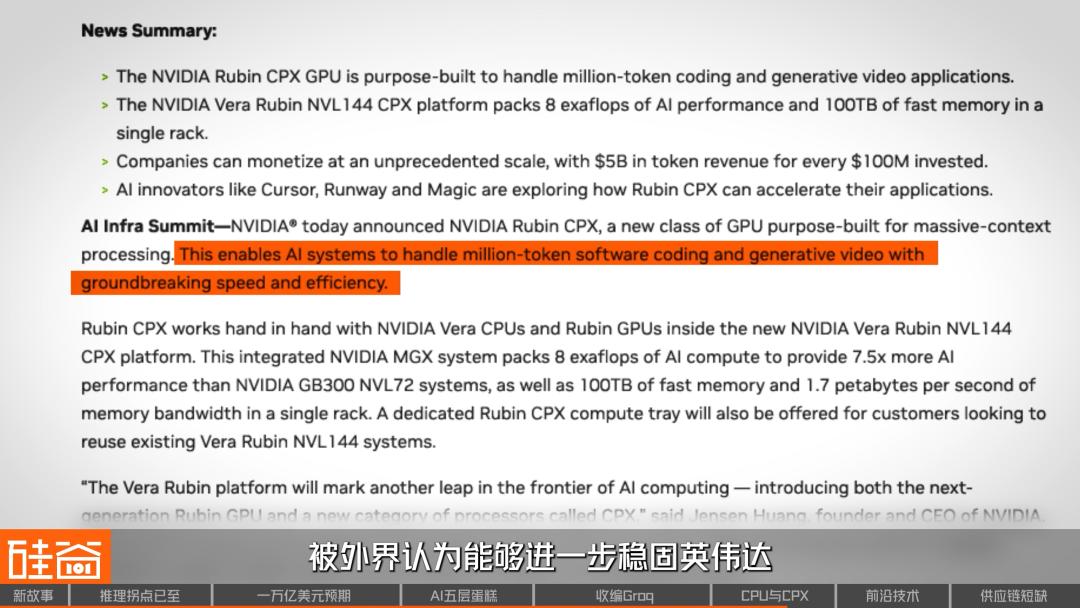 这是黄仁勋在去年9月的AI基础设施峰会上推出的、专门针对长语境推理进行优化的芯片,可以说代表了GPU设计的一个全新类别。这款芯片能够处理百万级tokens的软件编程和生成式视频,在速度和效率方面实现突破性提升,被外界认为能进一步稳固英伟达在推理上的优势。
