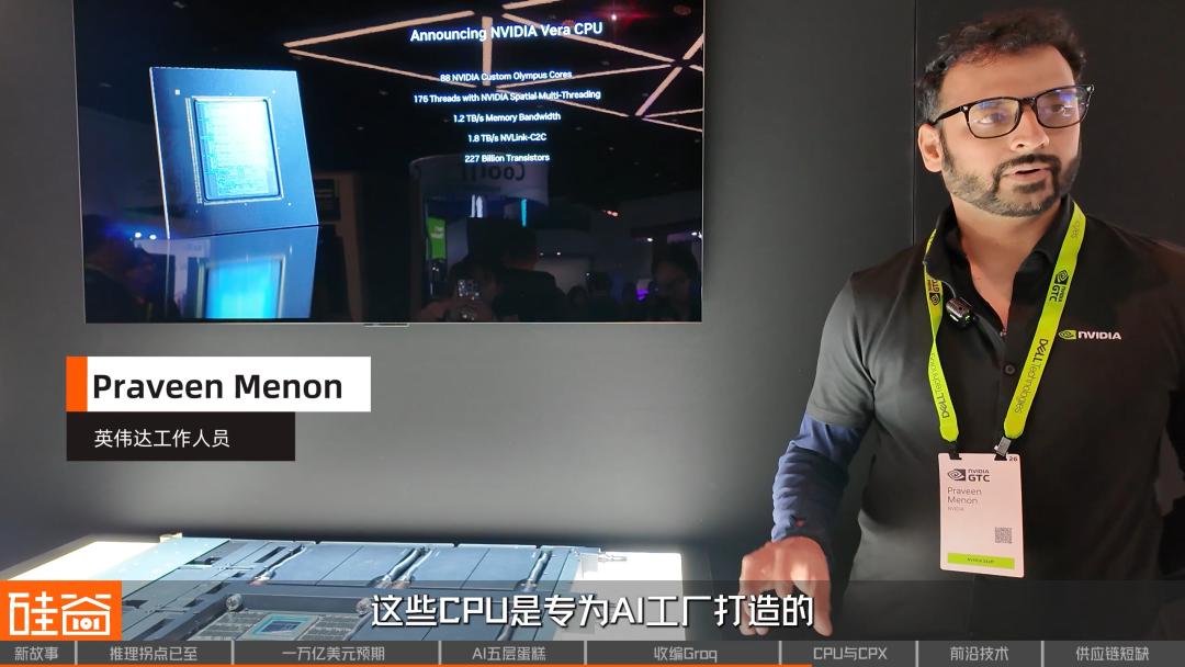 这些CPU是专为AI工厂打造的。当你们的GPU进行推理或强化学习训练时,它们会生成大量的软件代码,这些代码需要被评估正确与否,然后反馈需要传回给GPU。CPU承担了评估这些代码的任务,所以在那个阶段,你需要一个非常快的CPU来向GPU提供评估反馈,这样GPU就不需要加权了。这就是为什么我们专门打造这款产品,它具备极高的单核性能以及极大的内存带宽,这样数据就可以无缝移动,并且所有环节都能达到非常出色的机架级性能效率。所以,将所有这些结合在一起,就成就了一款非常适合智能体任务和AI工厂的理想CPU。