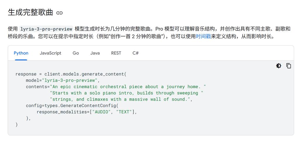 与此同时,面向开发者的Google AI Studio和Gemini API也同步上线了Lyria 3 Pro,与此前发布的Lyria RealTime(实时音乐生成能力)并列提供,开发者可以将这些能力集成到自己的应用中。