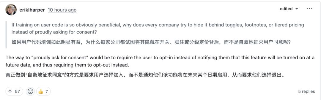 话虽如此,这一政策一出,再次让开发者社区对 AI 代码助手的数据使用边界展开讨论。
