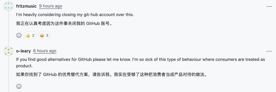 这对信任是一次严重打击。我正在强烈建议公司逐步迁离 GitHub。Copilot 本身并没有特别大的价值,更不值得你们擅自把我们的代码和想法通过大模型“分享”给其他人。