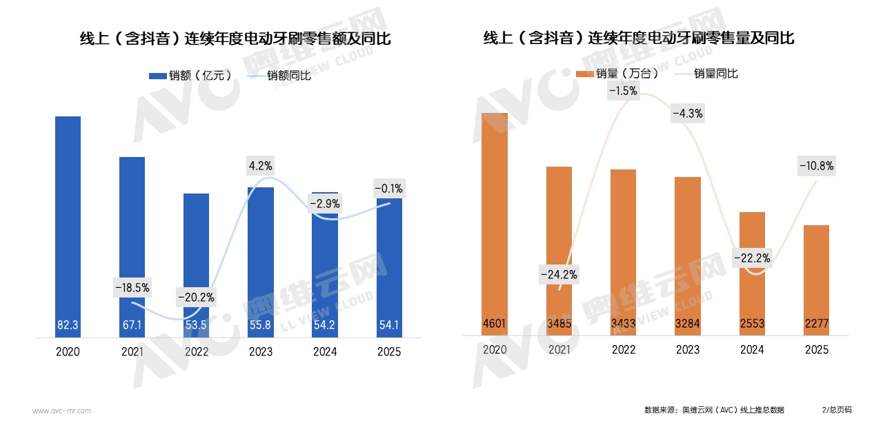 2025年,中国电动牙刷线上市场总销量2277万支,同比下降10.8%;销售额54.1亿元,同比微跌0.1%。