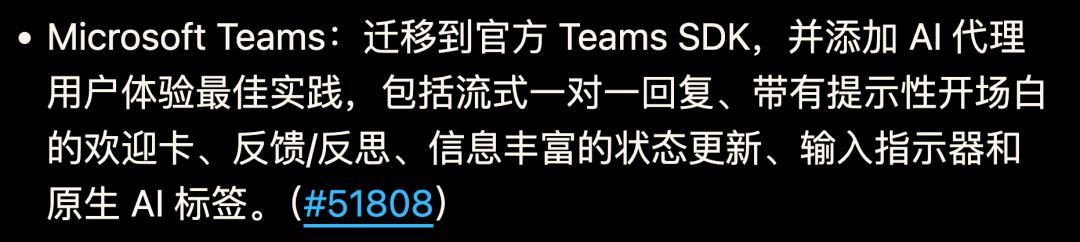 Microsoft Teams:迁移至官方 Teams SDK,并引入 AI Agent 交互最佳实践,包括单聊流式回复、带快捷提示词的欢迎卡片、反馈与反思机制、友好的状态提示、输入指示器,以及原生 AI 标签。