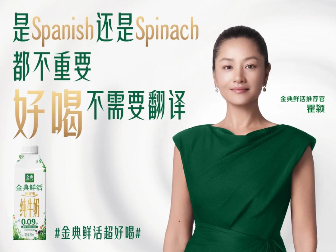 值得一提的是,金典在官宣海报中巧妙融入瞿颖近期出圈的多个热梗,形成了趣味十足的接梗互动。比如“来自上世纪末的姐亲测好喝”“这杯奶one hundred percent 好喝!”“是Spanish还是Spinach都不重要,好喝不需要翻译”。这一系列出圈的广告语引发了网友大规模好评,更有网友借势玩起了新梗形成了二创传播。