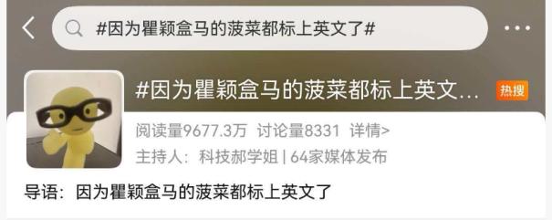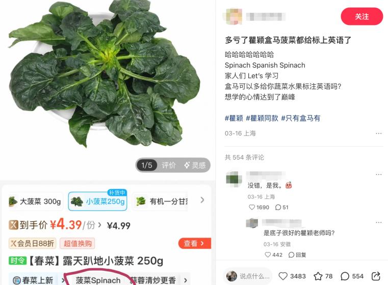 一向以网感与反应速度著称的盒马鲜生,第一时间抓住热点展开借势营销。瞿颖翻红后,有网友发现盒马APP内将菠菜的标签上添加了英文Spinach,#因为瞿颖盒马的菠菜都标上英文# 话题更是迅速登上了微博热搜。
