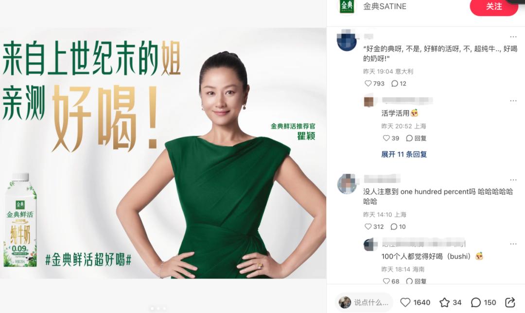 随着瞿颖意外翻红,多个品牌精准抓住时机,成功收割了这波流量红利。其中,欧莱雅借助节目官方植入,有效放大了品牌声量;而金典作为首个正式官宣与瞿颖合作的品牌,以深度贴合热梗的文案创意,收获网友一致好评。