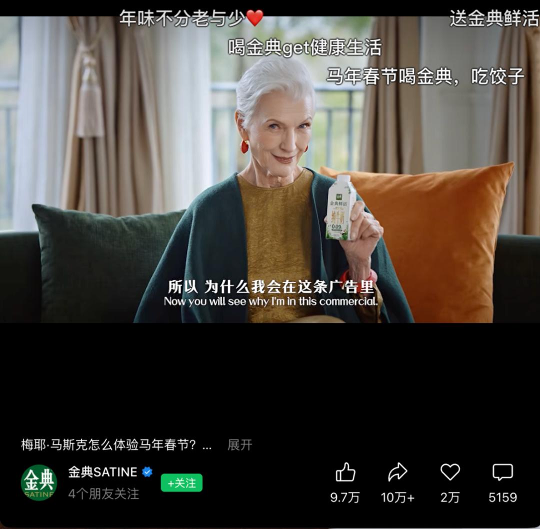 而在一众品牌扎堆跟风联动“马”姓艺人时,金典另辟蹊径,找来了梅耶·马斯克出镜马年新春短片,以国际观察者的视角诠释中国年俗文化,在同质化营销中实现差异化突围。