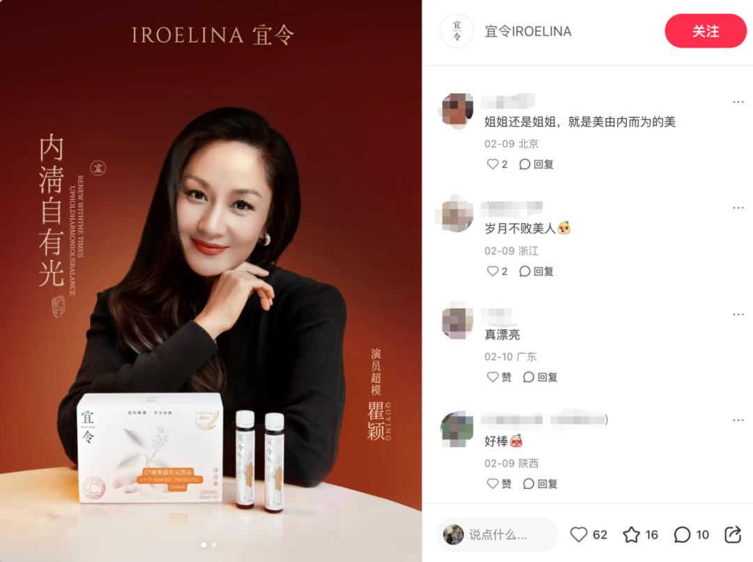 距离其翻红最近的一次合作是在今年2月初,合作品牌为养生品牌“宜令姜黄饮”,但从社媒讨论声量来看,该品牌并没有吃到瞿颖翻红这波流量。