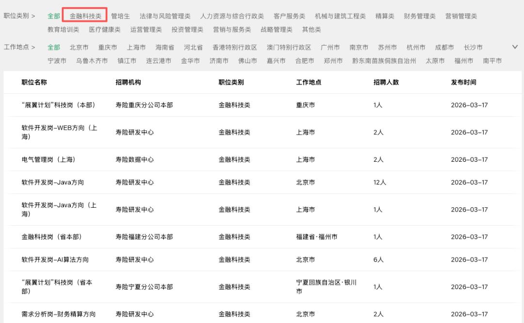 值得关注的是,保险机构今年亦更为重视AI人才的引进。以中国人寿的今年春招为例,金融科技类岗位在首个选项(如上图)。再如,阳光保险专门开设科技条线招聘,重点招募算法、大模型架构、大数据开发、Java开发等岗位人才;泰康保险旗下的泰康科技运营类职位中推出“泰康AI之星计划”,要求具备金融、科技、大健康领域与AI技术交叉的复合背景;中国人保财险设立AI研发工程师岗位,四大头部险企均专门划定科技类招聘赛道,凸显对科技人才的重视程度。