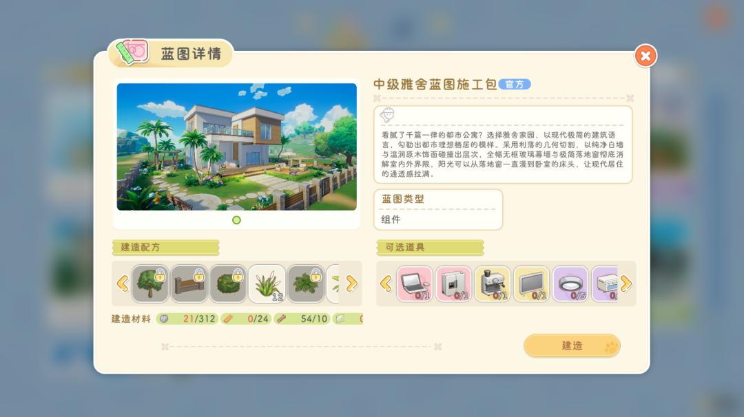 此外,在先前提到的建造与布置这一深度玩法上,游戏也贴心地为不同玩家提供了支持。对于像笔者这样缺乏“设计细胞”的玩家,游戏不但提供了丰富的官方建筑蓝图,更允许直接应用其他玩家分享的创意方案。