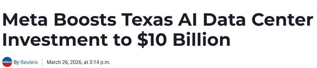 Meta周四宣布,将其位于得克萨斯州埃尔帕索的数据中心项目投资额从最初的15亿美元大幅扩大至100亿美元,目标到2028年实现1吉瓦的电力容量上线,以支持其大模型训练及全系应用的内容推荐系统。