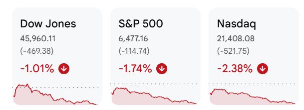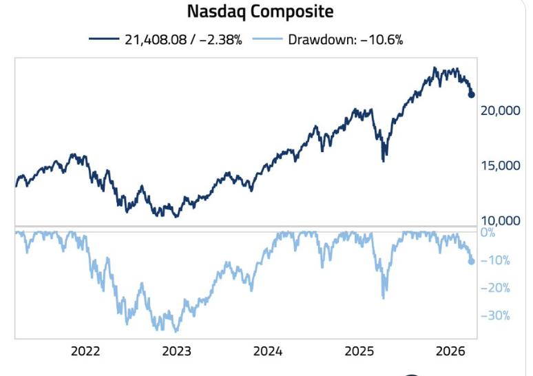 值得注意的是,相较于2025年10月29日创下的历史高点,纳指累计跌幅已正式超过10%,标志着该指数已步入技术性回调区域。