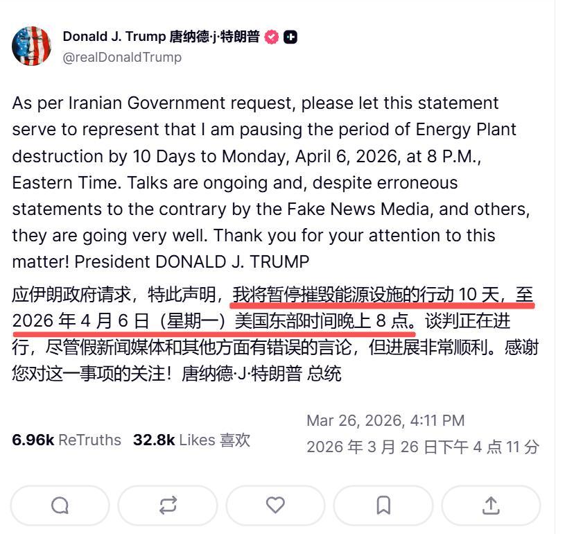 盘后时段,地缘政治消息面上再现波澜。特朗普在社交媒体发文表示,应伊朗Z府请求,将对伊朗能源设施的打击最后期限再推迟10天,至美东时间4月6日晚8点,并称谈判“非常顺利”。