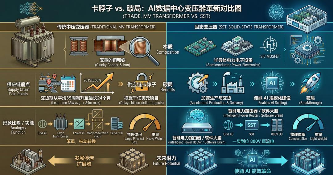 目前数据中心使用的传统中压变压器,本质上依然是“笨重的铜和铁”。在AI建设狂潮下,这类设备的供应链已经极度扭曲:交货期从平均35周飙升至最长24个月,比2019年高出60%。变压器卡脖子,直接拖累了科技巨头千亿美元级别数据中心的落地进度。