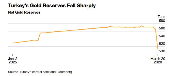 根据土耳其央行最新公布的数据,土耳其黄金储备在3月13日当周减少了6吨,3月20日当周又减少了52.4吨,储备正大幅下降。知情人士透露,部分黄金被直接出售,而大部分则通过掉期协议用于换取外汇或里拉流动性。