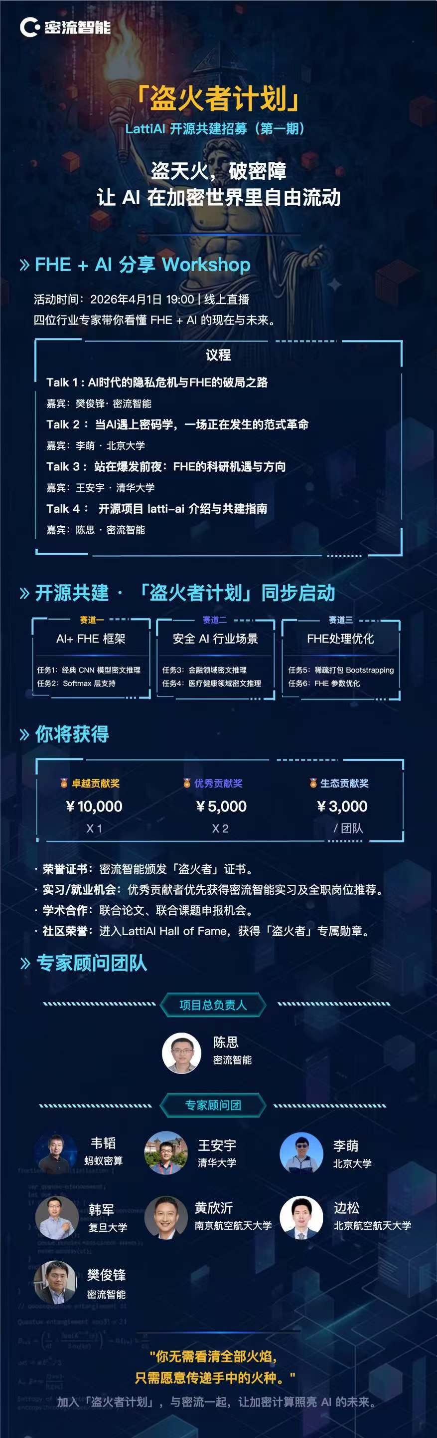 作为计划的启动活动,密流智能将于 4月1日(周三)19:00 举办线上 Workshop,邀请来自北京大学、清华大学、密流智能的4位专家,围绕 FHE+AI 的技术现状与未来方向展开分享: