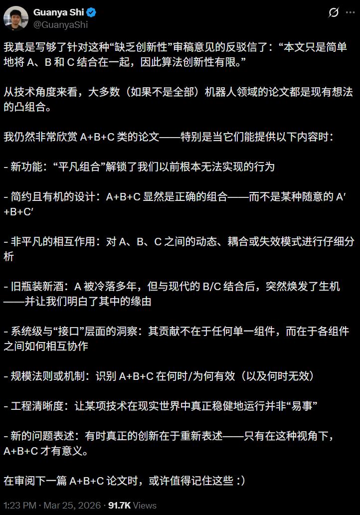 大多数机器人领域的论文都是现有想法的「凸组合」,真正的贡献在于组合本身解锁了什么新能力、揭示了什么非平凡的交互机制、让什么被冷落多年的旧想法重新焕发了生机。