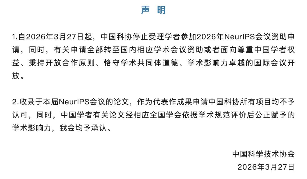 即日起停止受理学者参加2026年NeurIPS会议的资助申请,所有相关申请转至国内学术会议或其他「尊重中国学者权益、秉持开放合作原则」的国际会议。